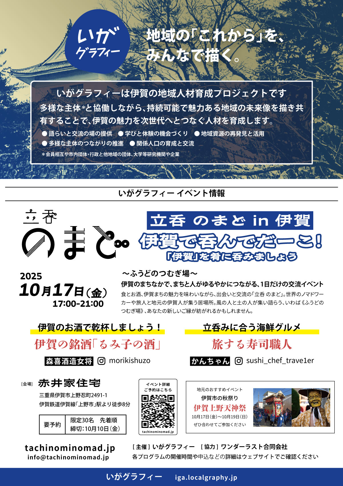いがグラフィーは、伊賀市域を主な対象として、人材育成と協働を通じて地域の未来像を描き、そのビジョンを共有するためのプラットフォームです。会員相互や他地域の団体、大学等研究機関、企業、学校、産業支援団体、行政と連携し、伊賀の魅力を次世代へとつなぎます。
